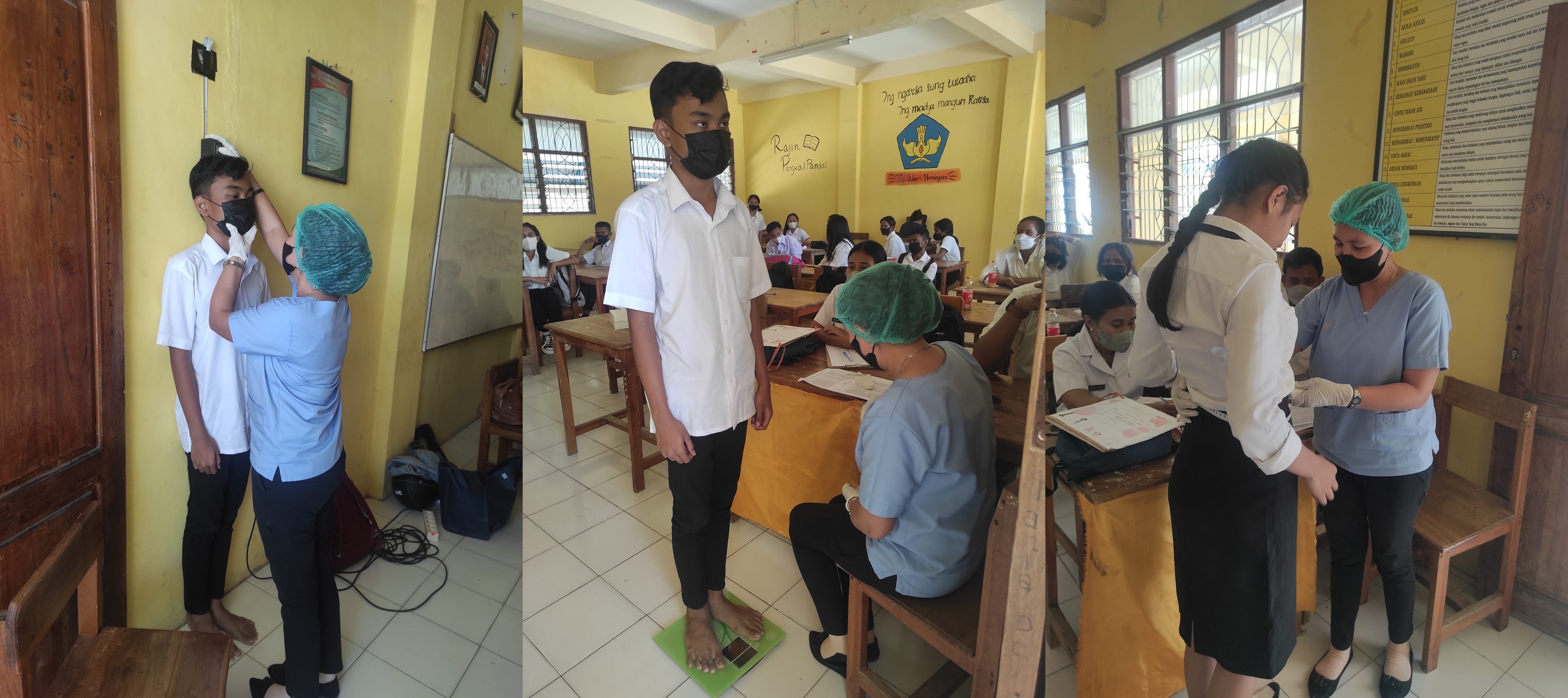 Kegiatan ini meliputi Penyuluhan tentang Kesehatan Reproduksi, Pengukuran berat badan, Tinggi Badan, Lingkar Perut dan Lingkar Lengan Atas, Pengukuran Tekanan Darah, Pemeriksaan buta warna, Pemeriksaan kebersihan Kuku, Mulut dan Telinga dan Screening Kesehatan Jiwa .