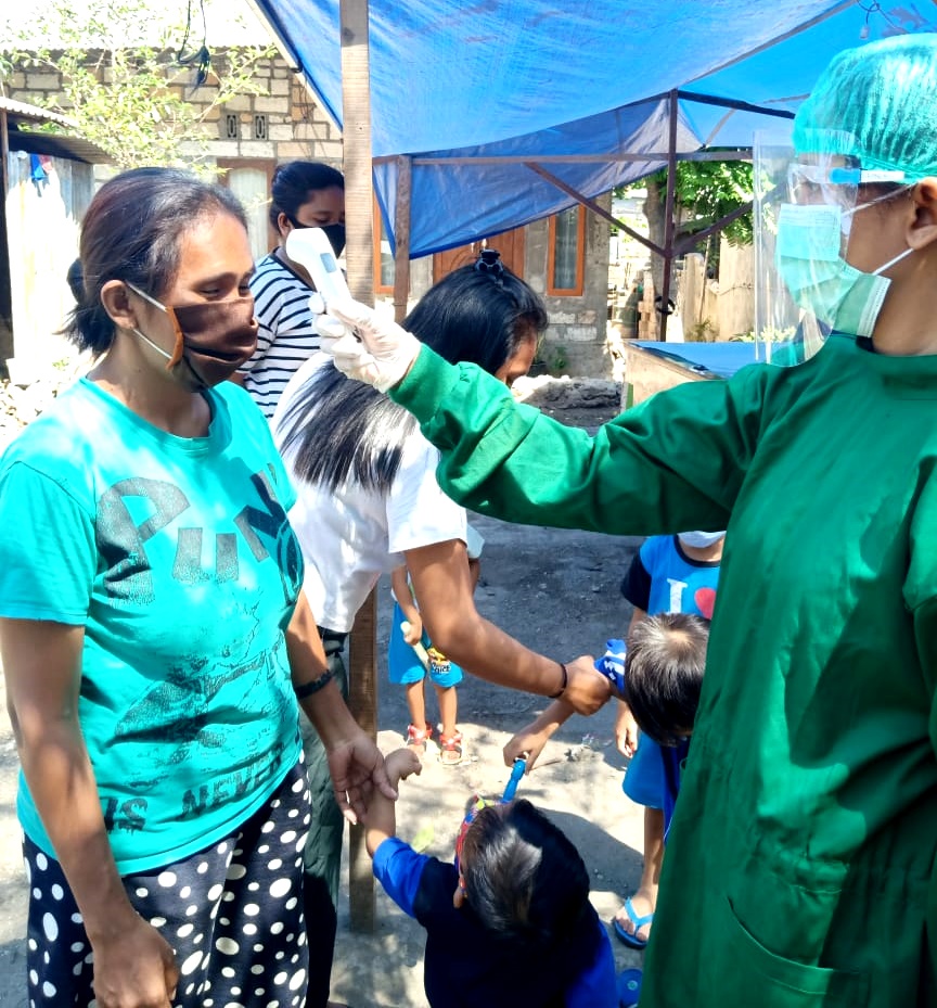 Perawat Lydia Manek, S.Kep, Ns. sedang mengukur suhu tubuh pengunjung sebelum mendapatkan pelayanan kesehatan